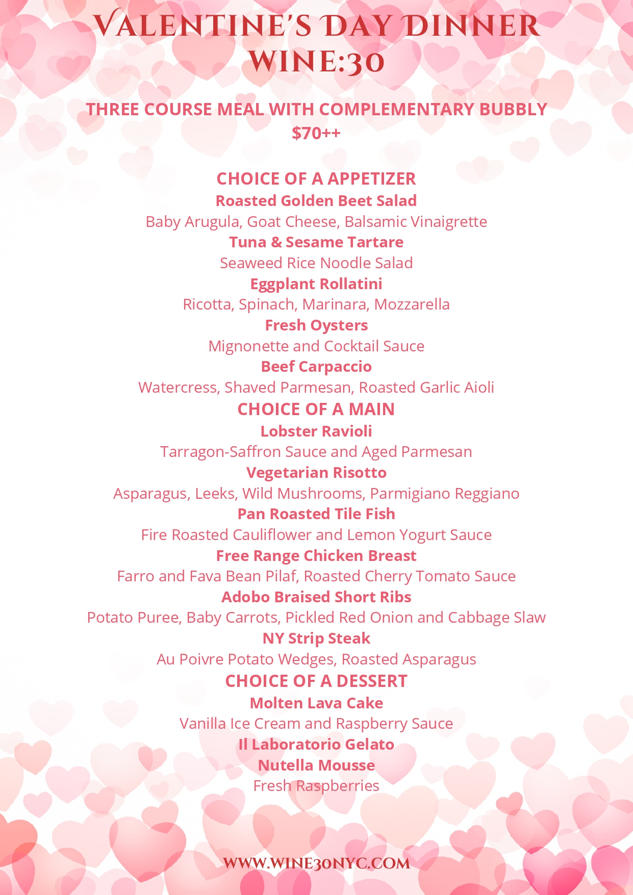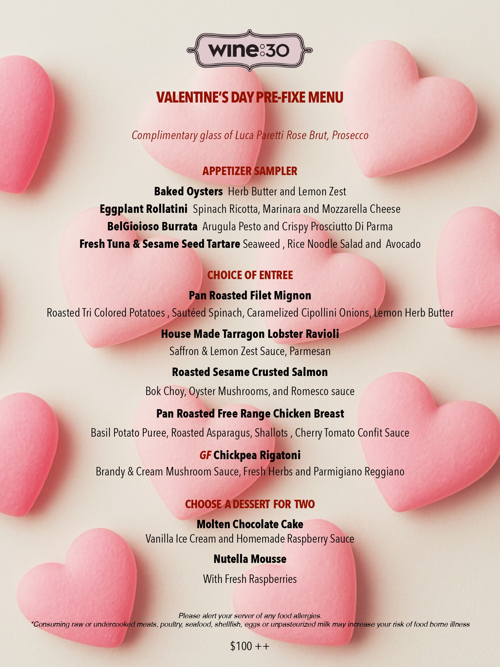 Order your favorite wine or let one of our knowledgeable staff members recommend a bottle or glass. Our ten years (and counting), Wine Spectator award winning wine list, has something to please the most discerning palate. Wine:30 also offers a full service bar, unique beer list as well as cocktails for our non oenophile guests.